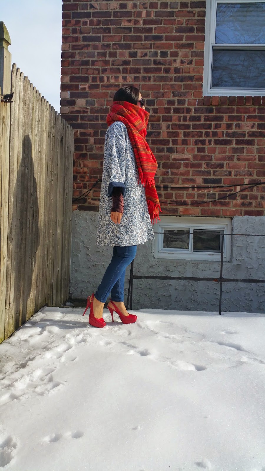 30 days until spring. Desperately waiting for spring to arrive. I cannot deal with this bone chilling cold, the freezing wind smacking your face off and snowstorms anymore. My Mother knows how cold it still is in NYC so, she (bless her heart) sent me another blanket scarf all the way from Nepal to keep me warm. It is in a luxurious red color with a hint of yellow. The measurements for this blanket scarf is 88"×44". This is one BIG blanket scarf. I paired this beauty with a velvet bodysuit, skinny jeans and a duster jacket. Added on strap on red heels to compliment my scarf. Thank you mommy for the love and if you guys want to check out my previous "Mother Knows Best" post click Here.